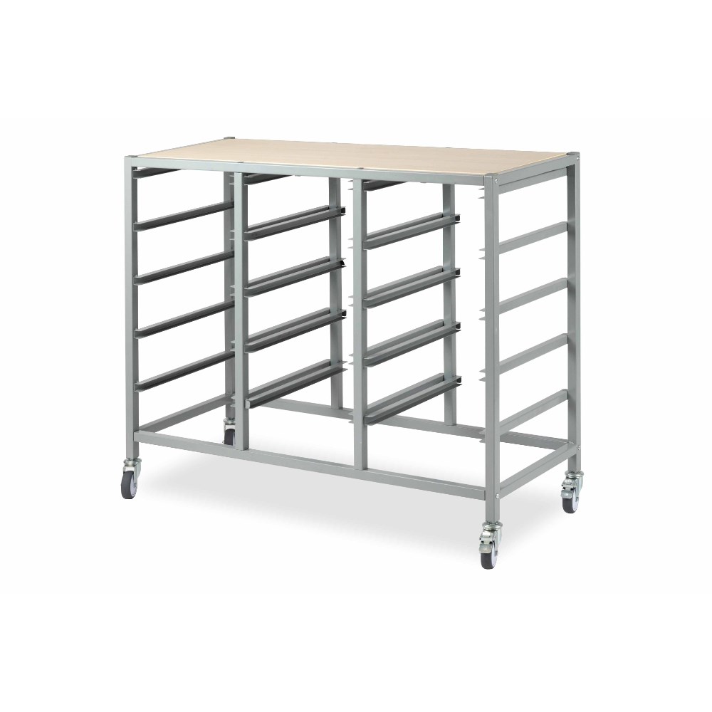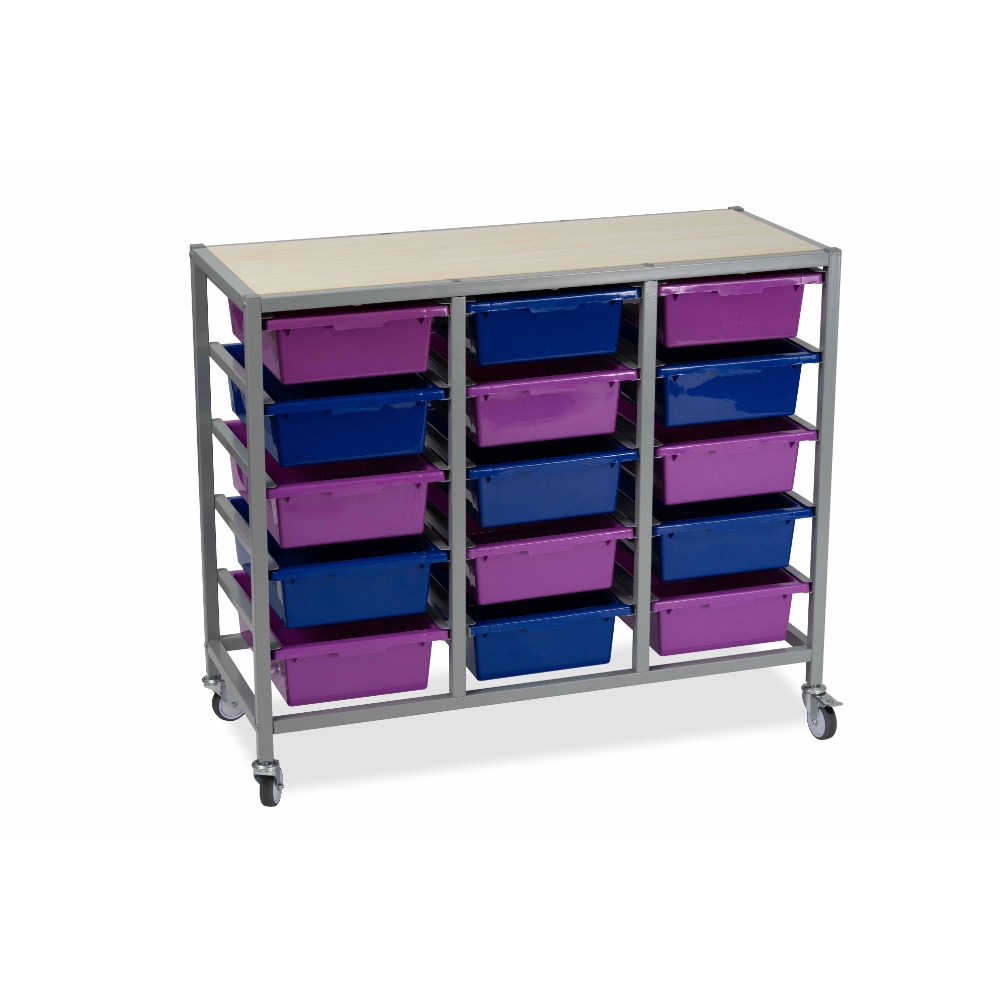 Triple trolley frame only. Perfect to use with the Tote trays range. Also available as 5 and 10 bay storage unit, please see codes 2793880 and 2793879. Mix and match the tote tray colours to create a stimulating learning space. The perfect storage solution for the classroom. Constructed metal frame and mounted on lockable castors. White or oak wood laminate finish top - choose when assembling. Delivery, installation and assembly charges may apply to furniture. Please enquire to confirm.