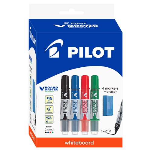 • Pilot BeGreen V Board Master Whiteboard Marker Bullet Tip Assorted Pack of 4 with Eraser
