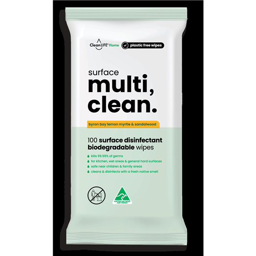 Surface Multi Clean Wipes are biodegradable cleaning and disinfecting wipes for general hard surfaces, leaving zero traces of microplastics. Kills 99.99% of surface bacteria and germs. Made from 100% plant based fibres, Surface Multi Clean Wipes contain Byron Bay Lemon Myrtle to provide additional antibacterial properties and combined with Sandalwood to create an authentic fresh smell on surfaces wherever used. kills 99.99% of germs for kitchen, wet areas & general hard surfaces safe near children & family areas cleans & disinfectants with a fresh native smell