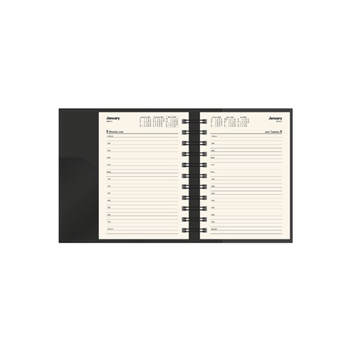 Ideal for those 'on the move' with its double wiro binding and heavily grained metallic and matt PU cover Printed on a subtle cream paper, each dated page layout features a six-month to opening calendar, week numbers, Julian days, as well as both national and international public holidays This series comes with the added feature of an internal storage pocket in the desk diaries. Features include: Australian and New Zealand holidays, 3-year calendars, current and forward year planners, international holiday list, international dialling guide and time zone map, staff leave and financial summary page, addresses and notes, card slot h 1 hour appointment 7am - 8pm