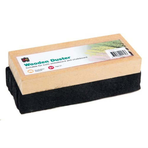 A hard wearing felt duster fitted with a wooden handle ideal for young children both at home and at school. Can be used on blackboards and whiteboards. Measures 110mmx50mm.