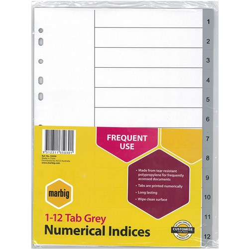 • Printed tab dividers. Tabs are printed numerically ranging from 1-12. Made from polypropylene.