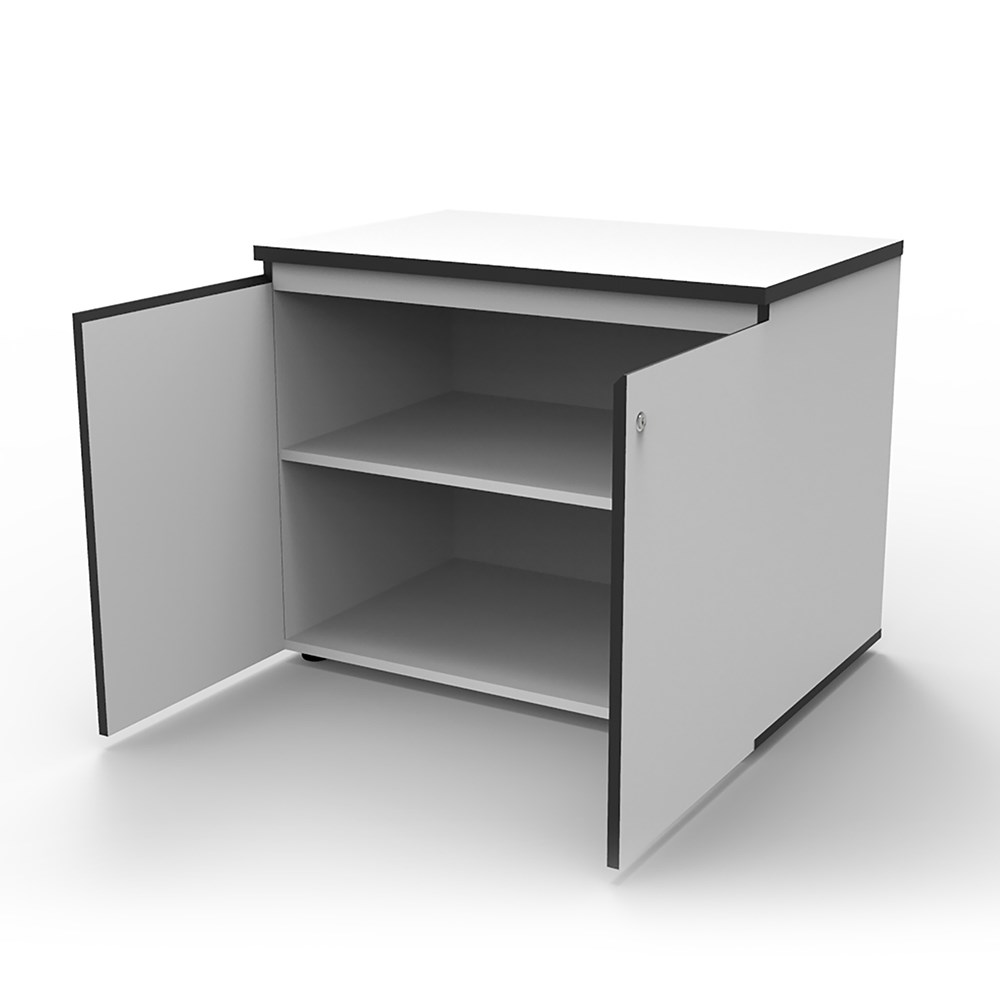 Deluxe Infinity Swing 2 Door Cupboard 900mm W x 600mm D x 730mm H Shark Nose Feature On Top Door Front For Easy Opening Lockable, Supplied With 2 x Keys Finished In Laminate With Black Rigid Edging Adjustable Levelling Feet