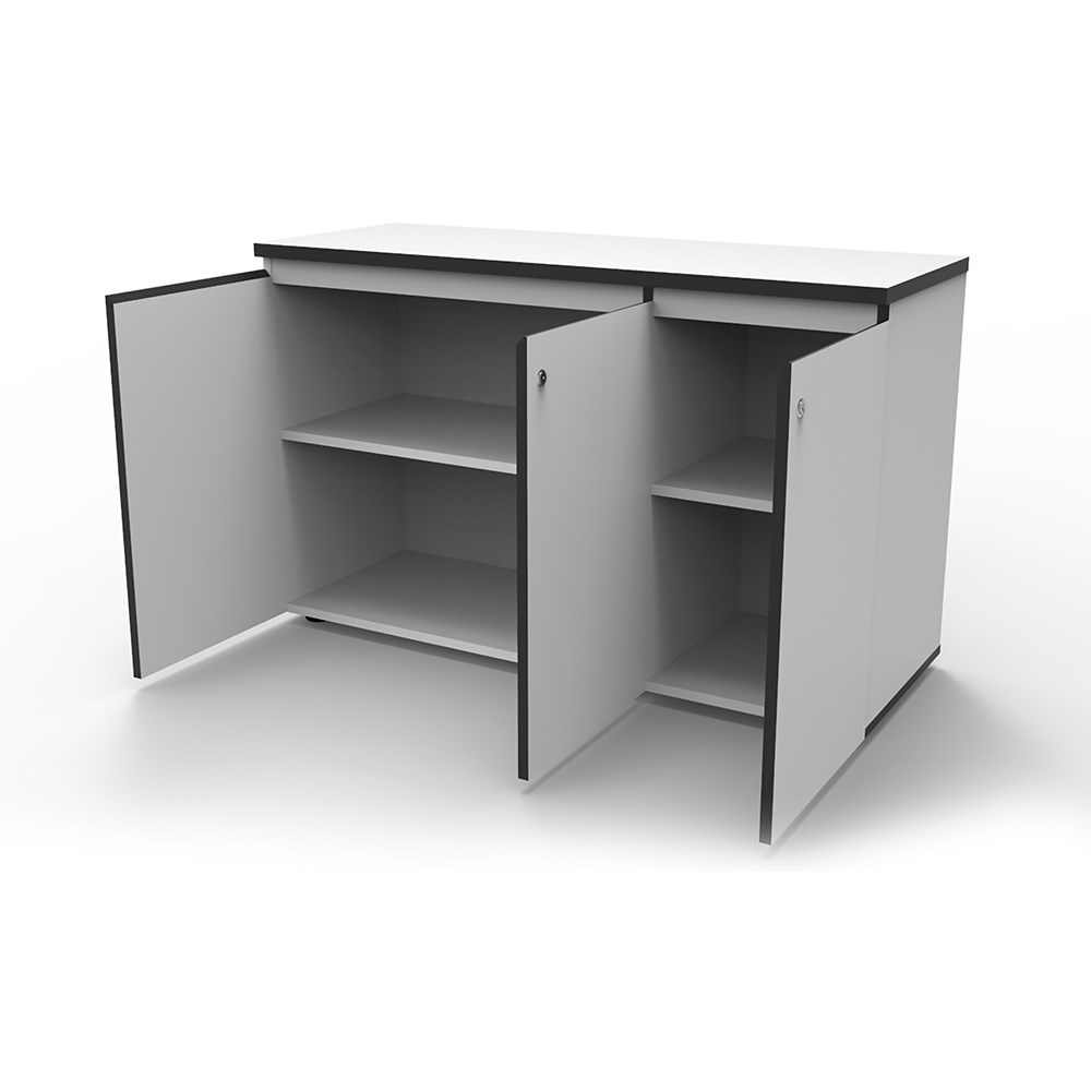 Deluxe Infinity Swing 3 Door Cupboard 1500mm W x 450mm D x 730mm H Shark Nose Feature On Top Door Front For Easy Opening Lockable, Supplied With 2 x Keys Finished In Laminate With Black Rigid Edging Adjustable Levelling Feet