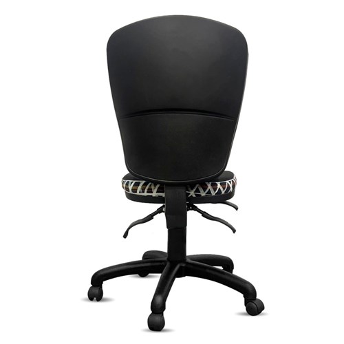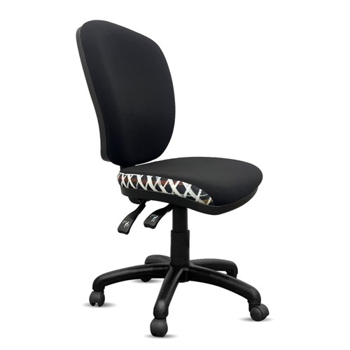 A unique commercial fabrics designed by Paulina Puruntatameri (Indigenous Artist) combined with K2 Black Fabric to upholster the chair. Weight rating: AFRDI Rated Load 160kg Approved. Indicated seat hours: 24/7. Seat Dimensions: 510W x 490D x 460-590mmH. Back Height: 560mmW. Back Width: 480mm. Heavy duty commercial chair with 3 lever mechanism and ratchet back height adjustment. 5 way 700mm commercial grade nylon base. Heavy duty gas lift cylinder. Moulded seat foam for supreme comfort. Fire retardant contoured moulded foam. Product image for reference only. Design pattern may differ as a result of variations in the art work. 10 Year Years Manufacturer's Warranty. Delivery, installation and assembly charges may apply to furniture. Please enquire to confirm. Optional adjustable armrest available. Refer to product code 3043352.