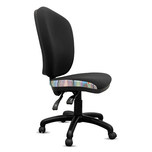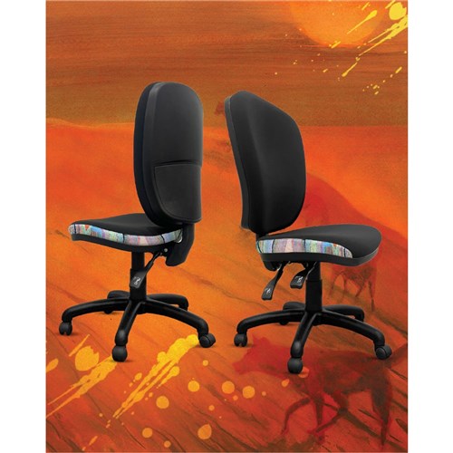 A unique commercial fabrics designed by Liddy Napanangka Walker (Indigenous Artist) combined with K2 Black Fabric to upholster the chair. Weight rating: AFRDI Rated Load 160kg Approved. Indicated seat hours: 24/7. Seat Dimensions: 510W x 490D x 460-590mmH. Back Height: 560mmW. Back Width: 480mm. Heavy duty commercial chair with 3 lever mechanism and ratchet back height adjustment. 5 way 700mm commercial grade nylon base. Heavy duty gas lift cylinder. Moulded seat foam for supreme comfort. Fire retardant contoured moulded foam. Product image for reference only. Design pattern may differ as a result of variations in the art work. 10 Year Years Manufacturer's Warranty. Delivery, installation and assembly charges may apply to furniture. Please enquire to confirm. Optional adjustable armrest available. Refer to product code 3043352.