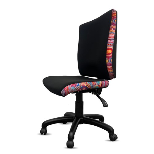 A unique commercial fabrics designed by Murdie Nampijinpa Morris (Indigenous Artist) combined with K2 Black Fabric to upholster the chair. Weight rating: 135kg. Indicated seat hours: 24/7. Seat Dimensions: 510W x 450D x 460-590mmH. Back Height: 580mmW. Back Width: 495mm. Heavy duty commercial chair with 3 lever mechanism and ratchet back height adjustment. 5 way 700mm commercial grade nylon base. Heavy duty gas lift cylinder. Moulded seat foam for supreme comfort. Fire retardant contoured moulded foam. Product image for reference only. Design pattern may differ as a result of variations in the art work. 7 Year Years Manufacturer's Warranty. Delivery, installation and assembly charges may apply to furniture. Please enquire to confirm. Optional adjustable armrest available. Refer to product code 3043352.