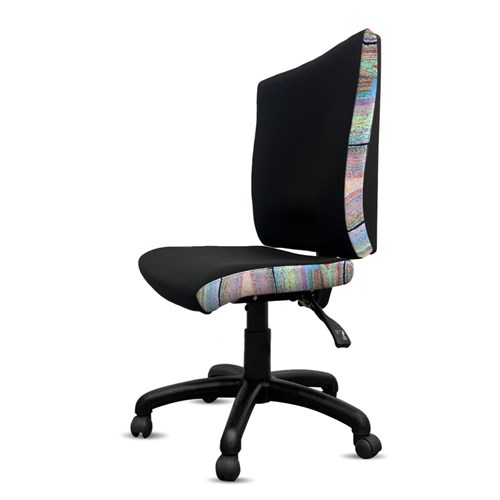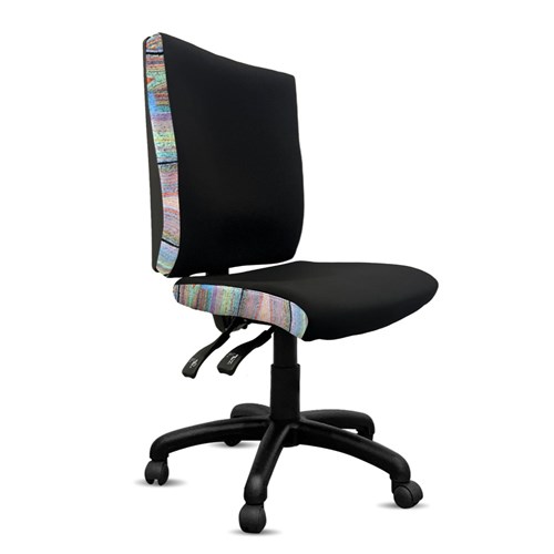 A unique commercial fabrics designed by Liddy Napanangka Walker (Indigenous Artist) combined with K2 Black Fabric to upholster the chair. Weight rating: 135kg. Indicated seat hours: 24/7. Seat Dimensions: 510W x 450D x 460-590mmH. Back Height: 580mmW. Back Width: 495mm. Heavy duty commercial chair with 3 lever mechanism and ratchet back height adjustment. 5 way 700mm commercial grade nylon base. Heavy duty gas lift cylinder. Moulded seat foam for supreme comfort. Fire retardant contoured moulded foam. Product image for reference only. Design pattern may differ as a result of variations in the art work. 7 Year Years Manufacturer's Warranty. Delivery, installation and assembly charges may apply to furniture. Please enquire to confirm. Optional adjustable armrest available. Refer to product code 3043352.