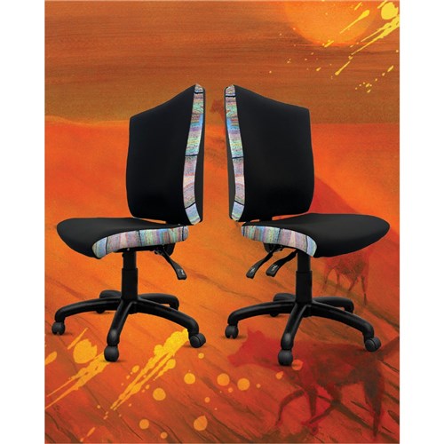 A unique commercial fabrics designed by Liddy Napanangka Walker (Indigenous Artist) combined with K2 Black Fabric to upholster the chair. Weight rating: 135kg. Indicated seat hours: 24/7. Seat Dimensions: 510W x 450D x 460-590mmH. Back Height: 500mmW. Back Width:495mm. Heavy duty commercial chair with 3 lever mechanism and ratchet back height adjustment. 5 way 700mm commercial grade nylon base. Heavy duty gas lift cylinder. Moulded seat foam for supreme comfort. Fire retardant contoured moulded foam. Product image for reference only. Design pattern may differ as a result of variations in the art work. 7 Year Years Manufacturer's Warranty. Delivery, installation and assembly charges may apply to furniture. Please enquire to confirm. Optional adjustable armrest available. Refer to product code 3043352.