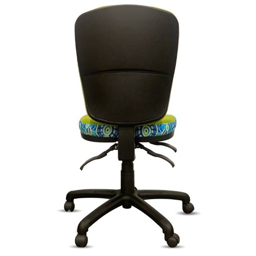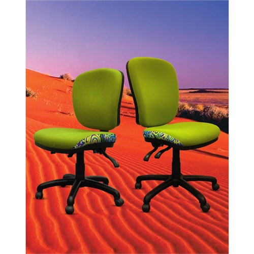 A unique commercial fabrics designed by Cedric Varcoe (Indigenous artist) combined with K2 Eucalyptus Green Fabric to upholster the chair. Weight rating: AFRDI Rated Load 160kg Approved. Indicated seat hours: 24/7. Seat Dimensions: 510W x 490D x 460-590mmH. Back Height: 560mmW. Back Width: 480mm. Heavy duty commercial chair with 3 lever mechanism and ratchet back height adjustment. 5 way 700mm commercial grade nylon base. Heavy duty gas lift cylinder. Moulded seat foam for supreme comfort. Fire retardant contoured moulded foam. Product image for reference only. Design pattern may differ as a result of variations in the art work. 10 Year Years Manufacturer's Warranty. Delivery, installation and assembly charges may apply to furniture. Please enquire to confirm. Optional adjustable armrest available. Refer to product code 3043352.