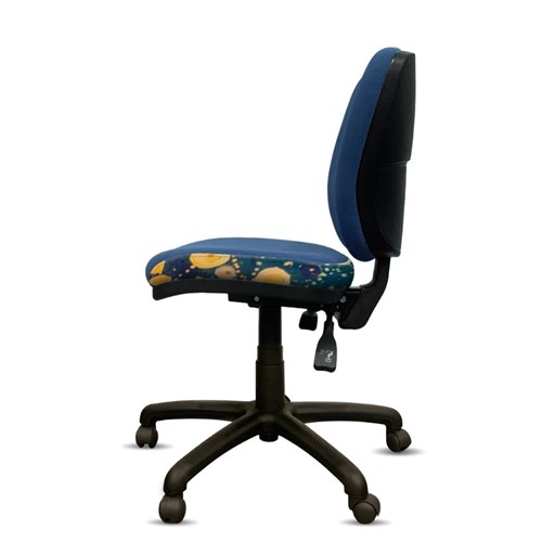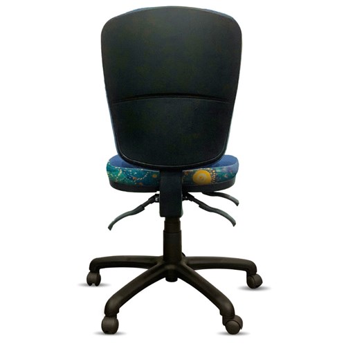 A unique commercial fabric designed by Stephen Jupurrurla Nelson (Indigenous artist) combined with K2 Ocean Blue Fabric to upholster the chair. Weight rating: AFRDI Rated Load 160kg Approved. Indicated seat hours: 24/7. Seat Dimensions: 510W x 490D x 460-590mmH. Back Height: 460mm. Back Width: 460mm. Heavy duty commercial chair with 3 lever mechanism and ratchet back height adjustment. 5 way 700mm commercial grade nylon base. Heavy duty gas lift cylinder. Moulded seat foam for supreme comfort. Fire retardant contoured moulded foam. Product image for reference only. Design pattern may differ as a result of variations in the art work. 10 Year Years Manufacturer's Warranty. Delivery, installation and assembly charges may apply to furniture. Please enquire to confirm. Optional adjustable armrest available. Refer to product code 3043352.