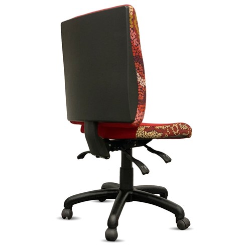 A unique commercial fabrics designed by Damien and Yilpi Marks (Indigenous artists) combined with K2 Red Ochre Fabric to upholster the chair. Weight rating: 135kg. Indicated seat hours: 24/7. Seat Dimensions: 510W x 450D x 460-590mmH. Back Height: 580mmW. Back Width: 495mm. Heavy duty commercial chair with 3 lever mechanism and ratchet back height adjustment. 5 way 700mm commercial grade nylon base. Heavy duty gas lift cylinder. Moulded seat foam for supreme comfort. Fire retardant contoured moulded foam. Product image for reference only. Design pattern may differ as a result of variations in the art work. 10 Year Years Manufacturer's Warranty. Delivery, installation and assembly charges may apply to furniture. Please enquire to confirm. Optional adjustable armrest available. Refer to product code 3043352.