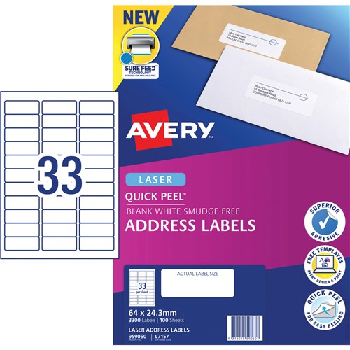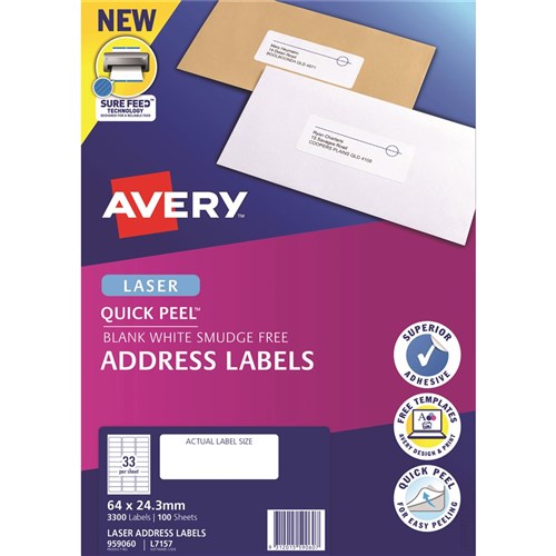 Label Laser Avery Address L7157-100 64X24.3mm 33 P/Page