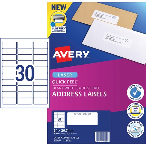 Label Laser Avery Address L7157-100 64X24.3mm 33 P/Page 524461 In Stock Low Stock Low Stock Please See Attributes