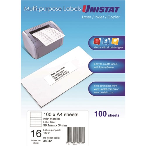 • Size: 99x38mm with margin, 1600 labels, 100 sheets, 16 labels per sheet (16UP).