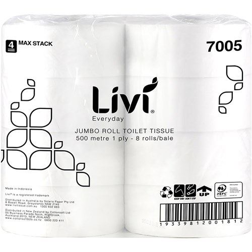 Livi Basics jumbo 1ply toilet paper fits a standard toilet roll for convenience and gives you the strength and quality of 1ply toilet paper, along with softness and value With a continuous roll and toilet paper made from virgin pulp, you are sure to get an excellent product. The toilet roll length is 500m, and there are eight units to a carton.