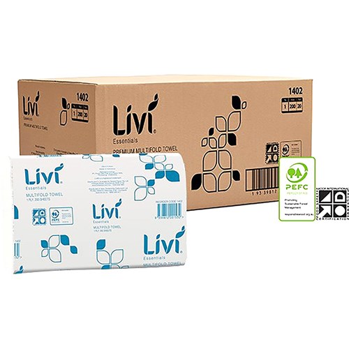 The Livi Essentials 1ply interleave towel is a premium embossed soft touch paper. The towel is made of 100% virgin fibres and is HACCP certified in hygienically sealed pack These disposable towels are PEFC certified guaranteeing environmentally responsible purchasing.
