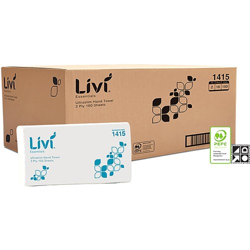 The Livi Essentials ultraslim towels boasts strong 2ply construction for maximum absorbency With single sheet dispensing, these disposable towels are PEFC certified guaranteeing environmentally responsible purchasing.
