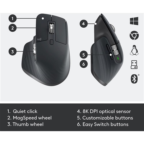 Work more comfortably with a perfectly-crafted full-size silhouette designed for the palm and easy control access. Speed and precision upgrade with 8000 DPI tracking for high-resolution monitors and MagSpeel Wheel scrolling, up to 1000 lines per second or precision line-by-line mode. Wireless with 2 ways to connect: Logi Bolt USB receiver, Bluetooth Low Energy Wireless Technology. Dimensions: 124.9H x 84.3W x 51mmD. Weight: 141g. 2 Year Manufacturer's Warranty.