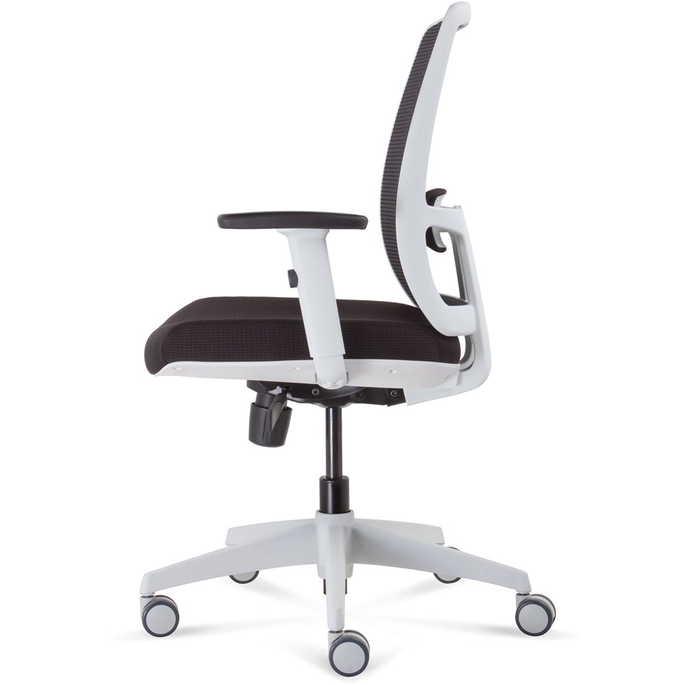 High back mesh executive chair with stylish white frame Synchro mechanism with adjustable arms ansi/bifma x 5.1-2011 and green guard gold certified 135kg weight rating 10 year warranty synchro mechanism with back rest and seat pan tilt gas lift, seat slide and lumbar support white 5 star base on castors black upholstered seat pan black mesh back