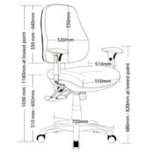 • Dimensions: 550W x 510D x 510-650mmH. Back: 520W x 550mmH. Back Adjustment: 550-640mmH. Overall Width including arms: 670mmW.