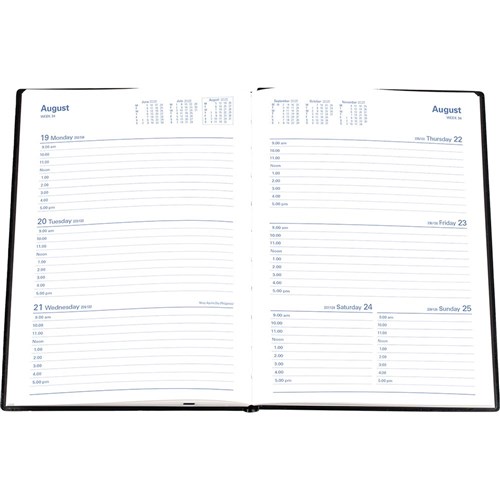 With a soft and luxurious feel to the black vinyl padded cover and the durable section sewn pagesInformation pages within the diary include Australian & New Zealand holidays and school terms, staff leave chart, current and forward year planners, important dates to remember, and much more.1 hour appointment 9am - 5pm