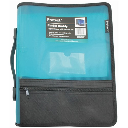 Protext Binder Buddys feature a stylish and durable polypropylene case, retractable handle and zipper closure They also include 2 inner pockets and an outside zipper pocket Transport A4 loose leaf notes, Binder Books and all your mobile stationery -ideal for students and professionals Also includes a handy name card holder Available in 3 cool colours