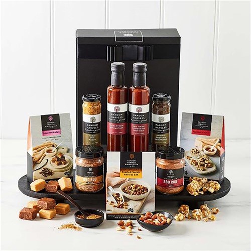The ultimate BBQ Gift Hamper from Random Harvest. Packed full of Australian made gourmet goodness, for a BBQ flavour journey like no other. With our signature rubs, sauces and condiments (and a couple of sweet treats) this is the perfect gift hamper for your favourite BBQ champion. Made from the finest quality ingredients, every single Random Harvest product is proudly Australian made. Presented in our high quality wooden gift crate, and finished with a satin Random Harvest ribbon, this is exceptional gifting for every occasion. Includes: Smoke & Pepper Sauce 250ml, Spicy Tomato & Caramelised Onion Sauce 250ml, Fireball Chilli Mustard 150g, Peppercorn Shiraz mustard 150g, Beef Rub 165g, Chicken Rub 150g,Popcorn Crunch 125g, Savoury Nuts 120g, Assorted Fudge 125g, Hamper Box. Take the hassle out of giving corporate gifts this year with a premium Random Harvest Christmas gift hamper. The Australian BBQ collection food hamper is stocked with premium 100% Australian gourmet BBQ sauces and condiments and will be enjoyed by everyone over the summer BBQ season. A Random Harvest gift hamper will make the perfect corporate gift for your staff and clients.