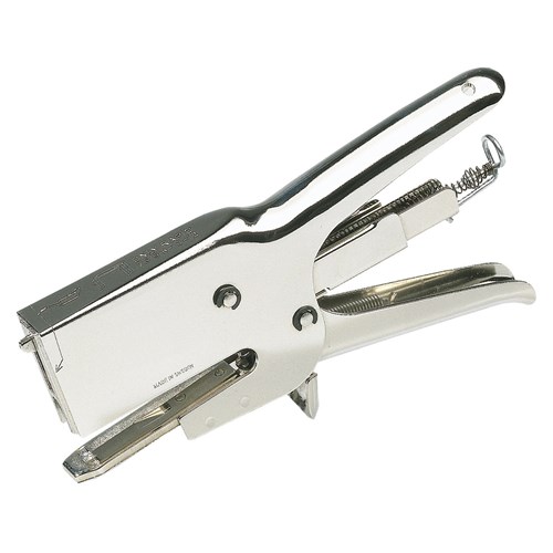 Powerful nickel-plated pliers with finger stop. Ideal for jiffy bags, small boxes etc. Works with 2 different anvils, easily attached with 2 screws. Perfect for postroom, office and warehouse. • Staples up to 70 sheets of paper (80 gsm) • Nickel-plated design and finger stop • With regular stapling anvil for 6 to 12 mm staples • Traditional back loading functionality • For 73/6-12 Rapid staples • Stapling depth: 65mm
