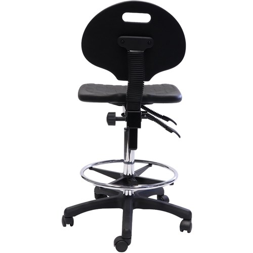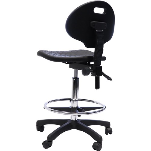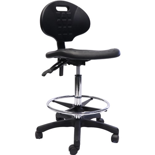 Rapidline Laboratory Drafting Stool Moulded Polyurethane Seat Pan & Back Rest - Contoured Waterfall Seat Back Height Adjustment Seat Tilt and Back Tilt With Infinite Lock Gas Height Adjustment Chrome Plated Height Adjustable Drafting Ring on 5 Star Black Nylon Base With Castors 110 Kg Weight Rating
