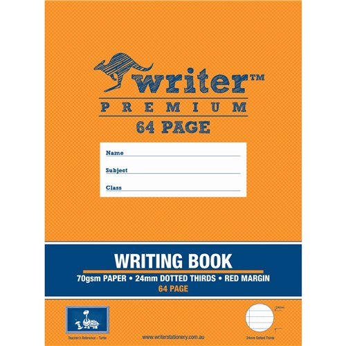 Writer Premium Writing Books feature heavy duty covers, high quality white 70gsm paper with blue Dotted Thirds ruled lines and a red margin 330x240mm size to ensure lots of writing space Unique cover colours and teachers references make each book easy to recognize Writer Premium Exercise Books also include an activity page, maths tables and conversion charts The Premium choice for all your school work