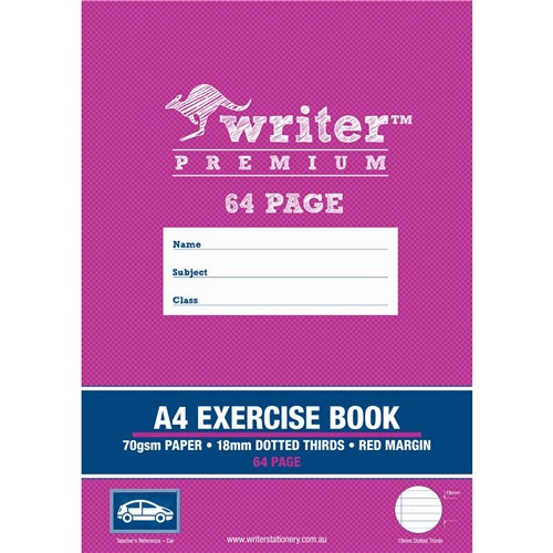 Writer Premium Exercise Books feature heavy duty covers, high quality white 70gsm paper with blue Dotted Thirds ruled lines and a red margin Unique cover colours and teachers references make each book easy to recognize Writer Premium Exercise Books also include an activity page, maths tables and conversion charts The Premium choice for all your school work