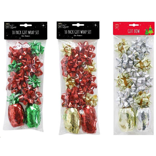 Xmas 10 Piece 10m Ribbon 70mm & 50mm Bows Assorted Colours
