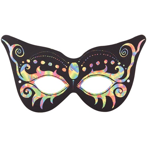 Two designs. Pre-cut masks. Includes 12 scratch tools and elastic. Bright rainbow colours underneath the black coating.