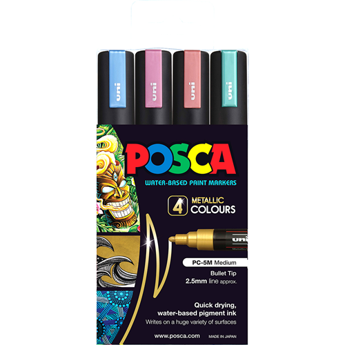 Medium 2.5mm Bullet Tip. Water-based pigment ink. Completely opaque. For use on most surfaces like glass, metal, wood, cloths, cardboard, and paper. This Set contains 4 markers. This set comes with 4 metallic markers in the following colours: Metallic Blue, Metallic Pink, Metallic Red and Metallic Green