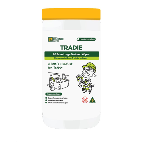 Great Aussie TRADIE wipes are extra-large textured wipes designed to clean up hands and surfaces for all types of construction trades, helping to remove tough and stubborn residues including adhesives, sealants, bitumen, grease, paint, oils, fillers, and coatings. Made from super tough plant-based fibres, these biodegradable wipes can be placed into green bins (without solid residues) or general waste. Will not scratch surfaces such as glass and metal during the clean-up process. Wipe Dimensions 250mm x 200mm Key Features Removes sealant and coating residueCleans tools and surfacesSafe on hands Australian Made and Manufactured Plastic Free & Biodegradable
