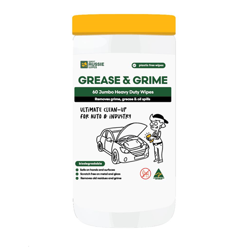 Great Aussie GREASE & GRIME wipes are jumbo sized heavy duty textured wipes designed to clean up hands, tools and surface in a range of industrial and automotive applications. Removes grease, oil, lubricants, grime, dirt, carbon black, paint, sealants and general automotive/industrial workshop residue. Wipe Size 300mm x 200mm Made from super tough plant-based fibres, these biodegradable wipes can be placed in green bins (without solid residue) or general waste. Will not scratch surfaces such as glass and metal during clean-up process. Key Features Scratch free on metal and glassRemoves old residues and grimeSafe on hands and surfaces Australian Made and Manufactured Plastic Free & Biodegradable