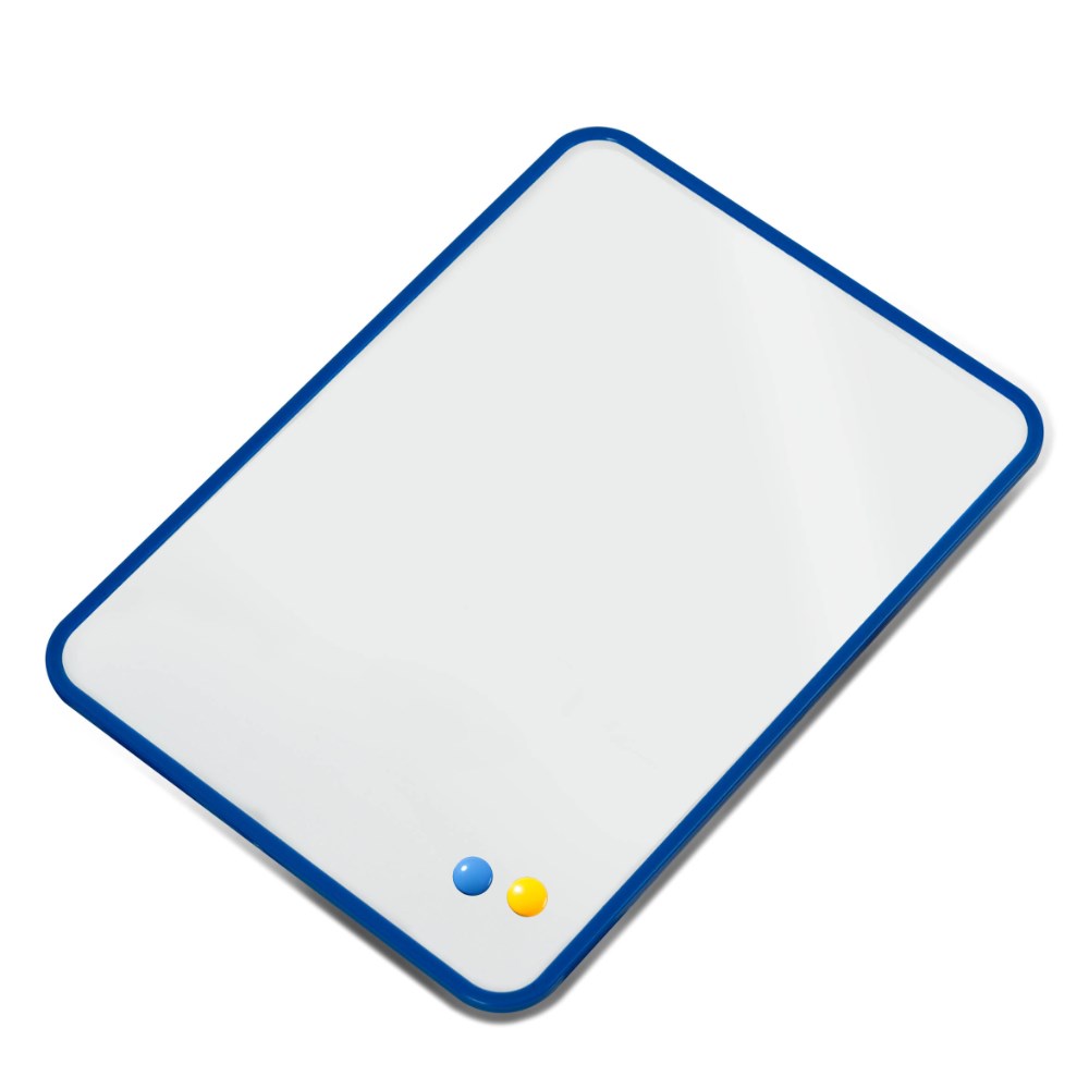 Double sided, Plain both sides. Lightweight magnetic whiteboards ideal for agile education. Great for collaborative group and individual focused learning. Add the optional Magnetic eraser/marker to make a complete individual student whiteboard solution, please see product 3039136. Size: 420W x 297mmH. Sturdy navy blue moulded frame. Save paper and allow students to practice skills. Use any whiteboard markers, wipes clean easily.