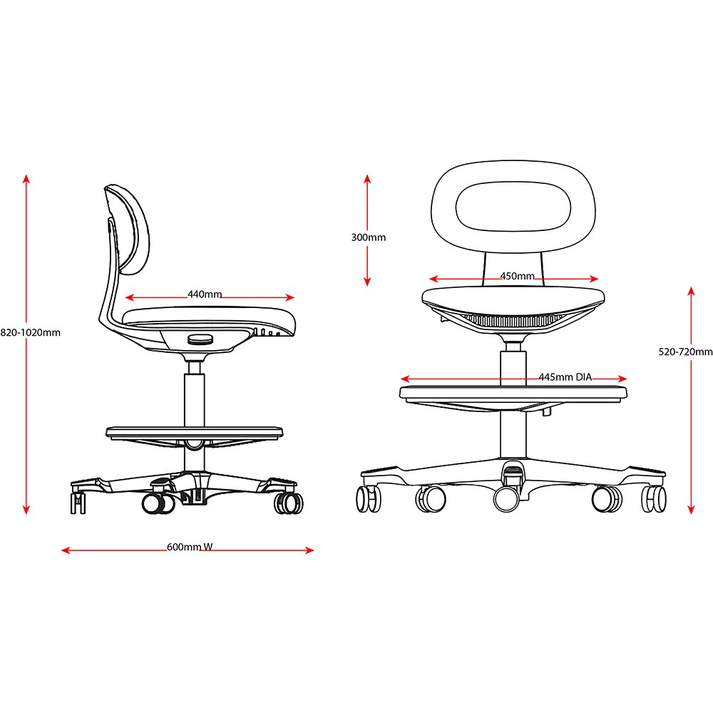 • Chair Dimensions: Seat 450W x 440D x Seat 520-720mmH. Overall height: 820-1020mmH.