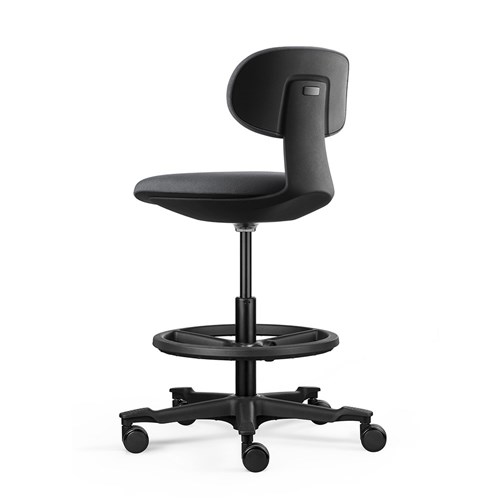 A height-adjustable sit-stand chair. The moulded foam seat and back and the nylon base with castors ensure user comfort and easy mobility. Wire-Control height adjustable mechanism. Castors. Black nylon 5 star base with Top Grip Treads. Curved, ratchet backrest. Greenguard Gold and BIFMA certified. Weight rating 110kg. Black Nylon Drafting Ring - 445mm Diameter. Chair Dimensions: Seat 450W x 440D x Seat 520-720mmH. Overall height: 820-1020mmH. 10 Year Manufacturer's Warranty.
