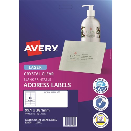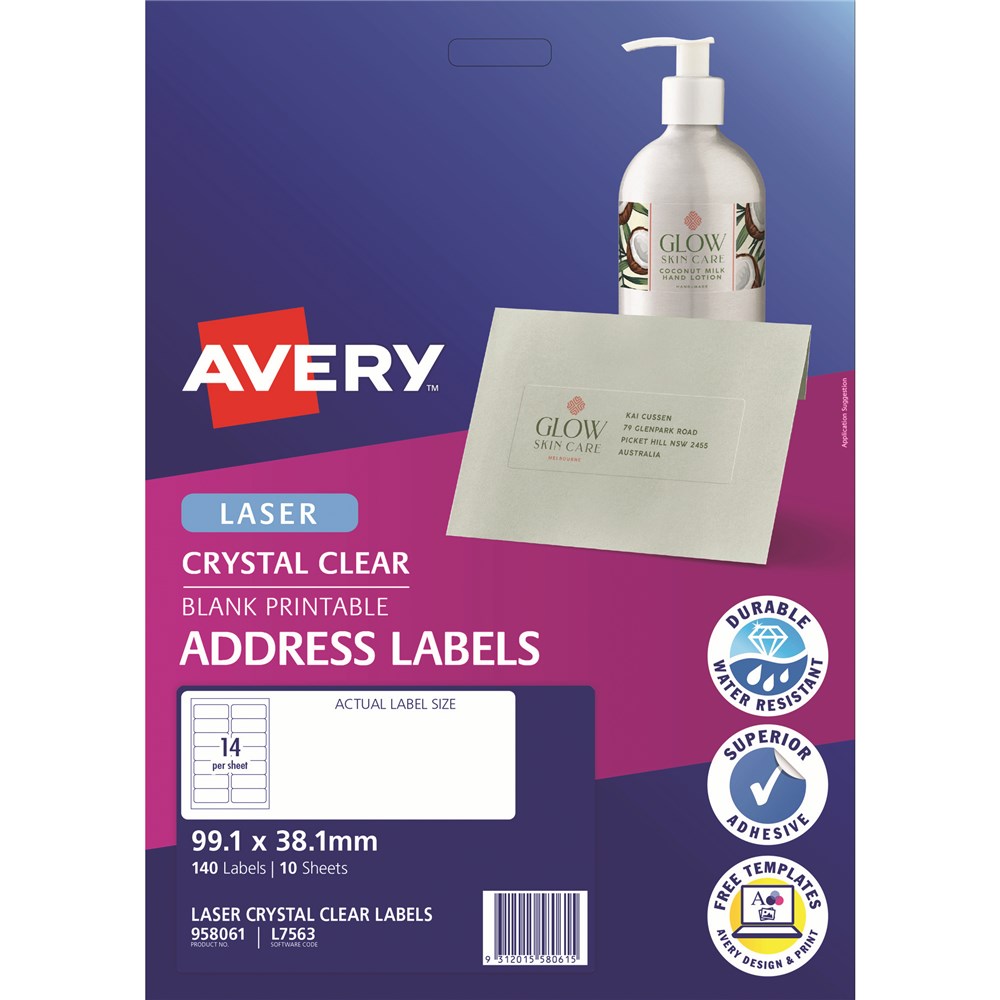 Premium glossy clear material is 100% transparent Ideal for coloured envelopes, invitations and events Customise your labels with our free and easy-to-use template software; Avery Design and Print - available at averyproducts.com.au/print Jam-Free reliability for trouble free printing on Laser printers, saving time and minimising wastage Suitable for Laser printers