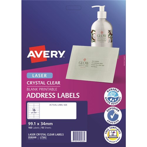 Premium glossy clear material is 100% transparent Ideal for coloured envelopes, invitations and events Customise your labels with our free and easy-to-use template software; Avery Design and Print - available at averyproducts.com.au/print Jam-Free reliability for trouble free printing on Laser printers, saving time and minimising wastage Suitable for Laser printers