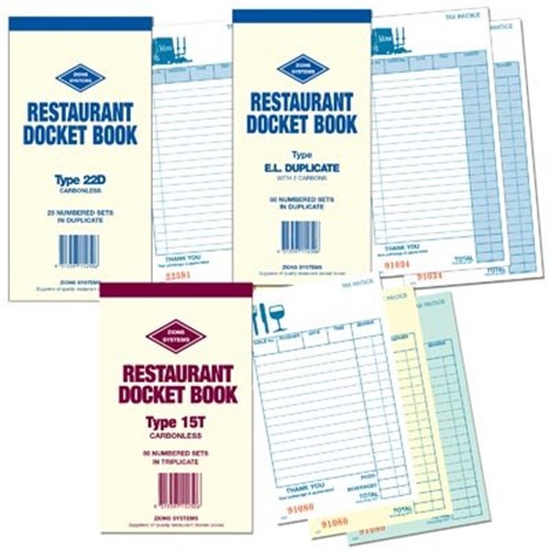 • Zions offers a wide range of single, duplicate, triplicate and quadruplicate restaurant docket books, suitable for all styles of bistros, cafes, restaurants and take-away outlets.