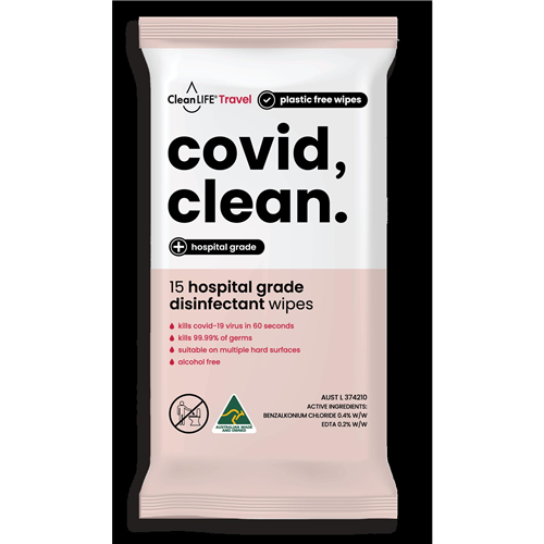 COVID CLEAN WIPE - CLS00101 Covid Clean Wipes are ready to use hospital grade wipe for disinfecting a wipe variety of surfaces and common touch point areas. Impregnated with a solution formulated to provide broad antimicrobial effectiveness against a range of bacteria including: S. aureus; E.Coli; P.aeruginosa; E.hirae. Also proven efficacy against Covid-19 Virus. Covid Clean wipes provide strong disinfection action with no residual odours on surfaces. Suitable for regular use over surfaces exposed to germs and risk of spread. Not to be used on skin. kills covid-19 virus in 60 seconds kills 99.99% of germs suitable on multiple hard surfaces alcohol free Plastic Free, Compostable & Biodegradable Australian Made and Manufactured