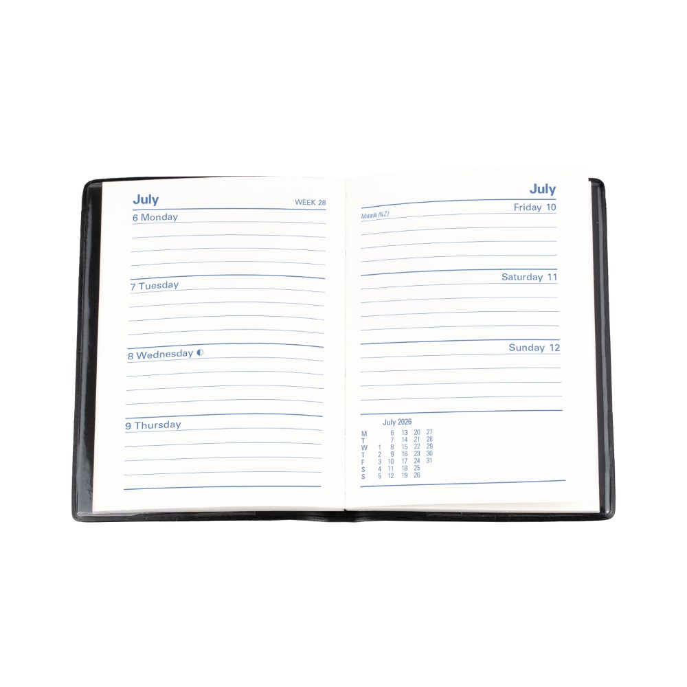 Bound in a highly durable, welded PVC cover, the Belmont series is available in black, cherry red, and navy. Printed on white paper, the series includes features such as appointment times, a six month to opening calendar on each dated page layout, week numbers, Julian days, Australian and international holidays. Features include Australian and New Zealand holidays, 3-year calendars, Forward year planners, Calendar notes, Financial summary page, Notes