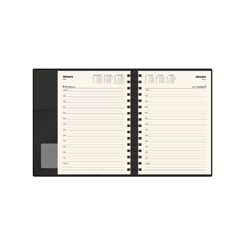 Ideal for those 'on the move' with its double wiro binding and heavily grained metallic and matt PU cover Printed on a subtle cream paper, each dated page layout features a six-month to opening calendar, week numbers, Julian days, as well as both national and international public holidays This series comes with the added feature of an internal storage pocket in the desk diaries. Features include: Australian and New Zealand holidays, 3-year calendars, current and forward year planners, international holiday list, international dialling guide and time zone map, staff leave and financial summary page, addresses and notes, card slot h 1 hour appointment 7am - 8pm