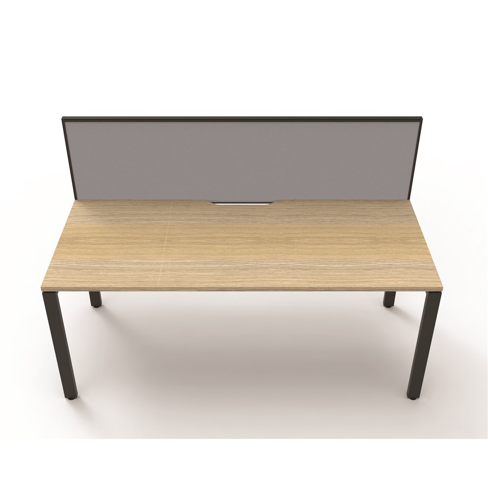 With Screen Natural White Worksurface With 410mm W x 50mm D Scallop Cable Access 1200mm W x 780mm D x 730mm H (Overall), 1200mm W x 750mm D x 730mm H Per User 60mm x 30mm Profile Leg Underframe In Black P/C 495mm H x 30mm T Pinnable Privacy Screen Upholstered In Grey Fabric With Matching Black Powdercoat Extrusion Adjustable Levelling Feet 5 Year Manufacturer's Warranty