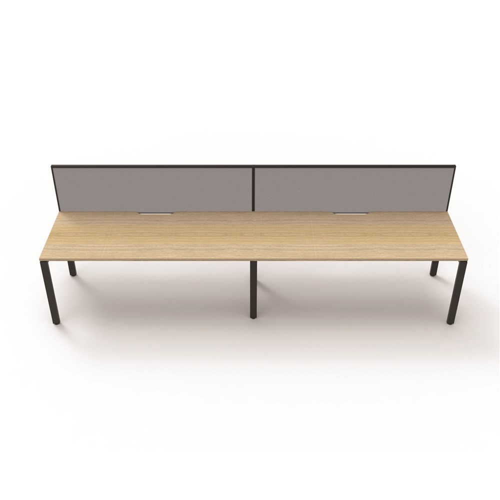With Screen Natural White Worksurface With 410mm W x 50mm D Scallop Cable Access 2400mm W x 780mm D x 730mm H (Overall), 1200mm W x 750mm D x 730mm H Per User 60mm x 30mm Profile Leg Underframe In Black P/C 495mm H x 30mm T Pinnable Privacy Screen Upholstered In Grey Fabric With Matching Black Powdercoat Extrusion Adjustable Levelling Feet 5 Year Manufacturer's Warranty
