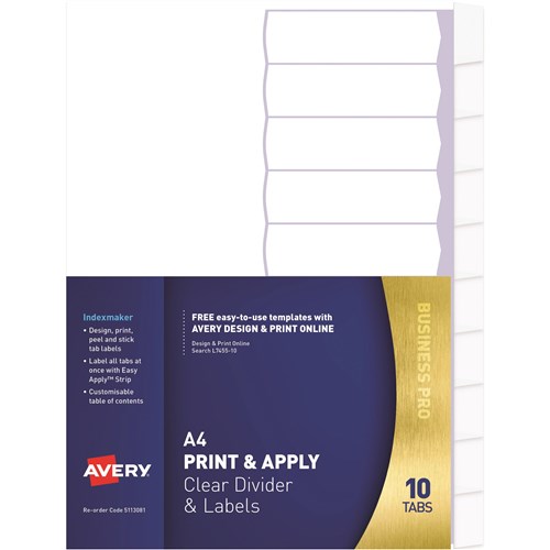 Avery L7455-10 A4 10 Tab Print & Apply Label Clear Dividers