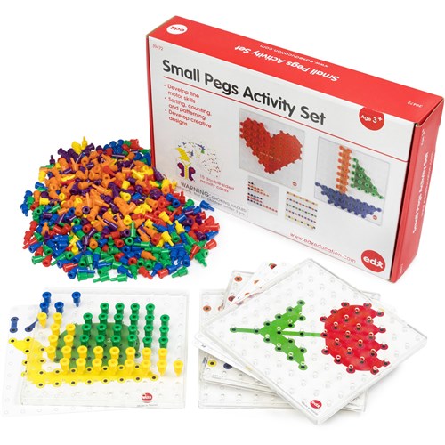 • Set includes 600 pegs in 6 bright colours, 4 clear peg boards, and 15 x double sided activity cards.